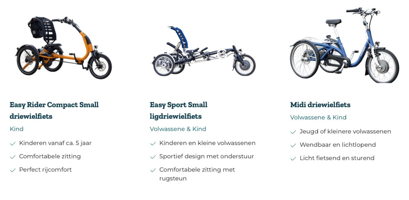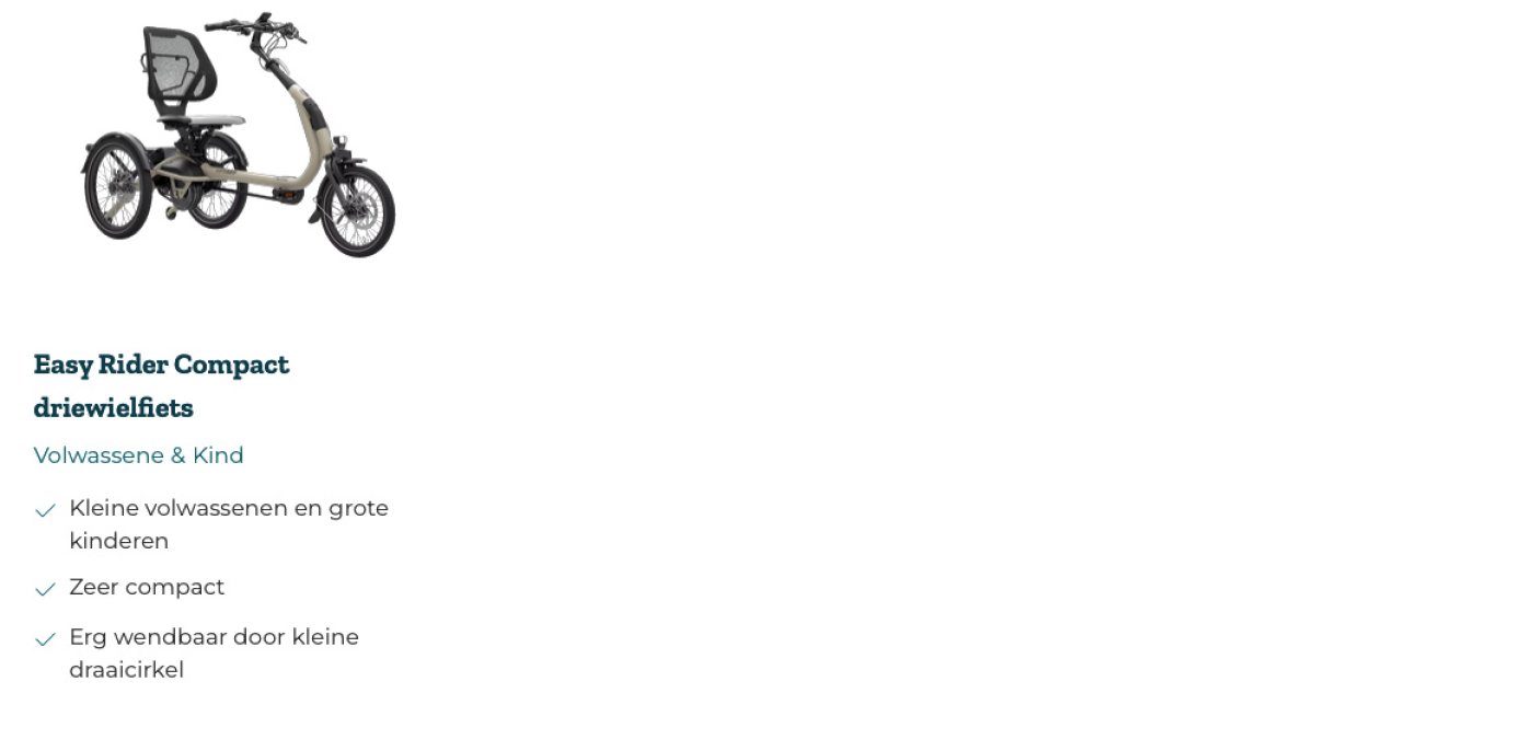 Er is een ruime keuze aan kinderdriewielers in verschillende maten en voor uiteenlopende leeftijden. Zo zijn er modellen met een comfortabele zitting, zoals de Easy Rider Compact en de Compact Small, maar ook de klassieke Midi en de sportieve Easy Sport Small met een laag stuur. Elk model is ontworpen met oog voor stabiliteit, veiligheid en plezier tijdens het fietsen.