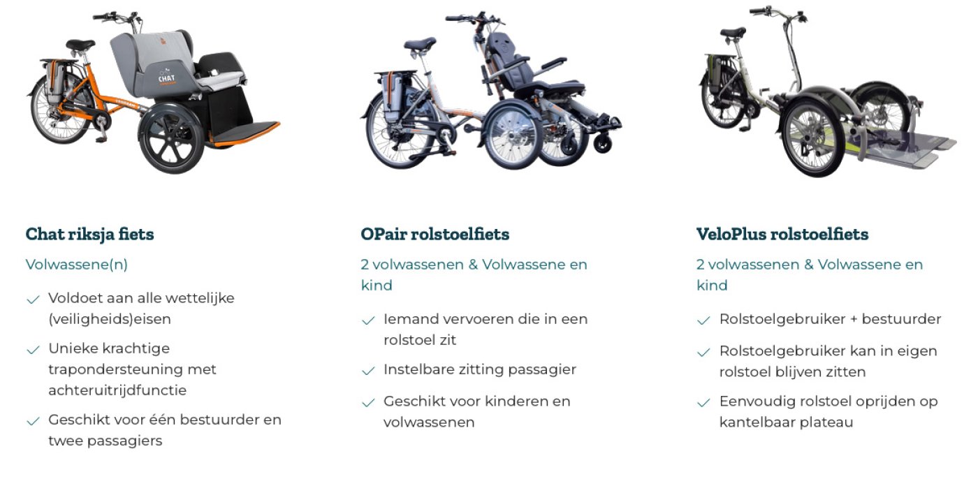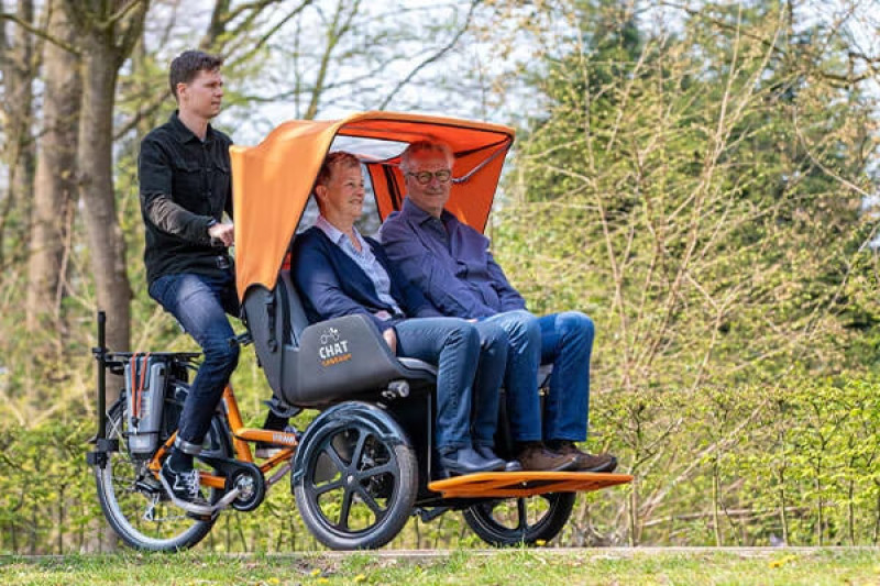 De riksjafiets Chat, winnaar van de Eurobike Gold Award, is ontworpen om samen op pad te gaan met volwassenen of kinderen die niet meer zelfstandig kunnen fietsen. Een begeleider trapt terwijl één of twee passagiers voorin naast elkaar plaatsnemen in een comfortabel vormgegeven kuip, waarin design en ergonomie zijn gecombineerd. De bestuurder zit daarachter en heeft goed zicht op zowel de weg als de inzittenden.